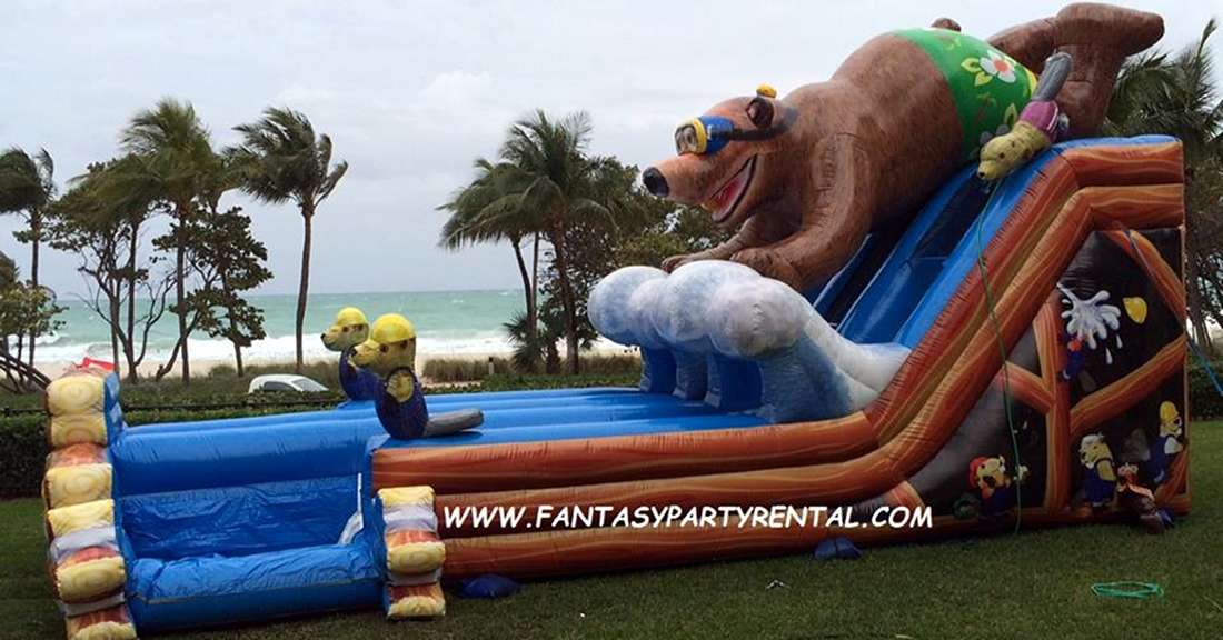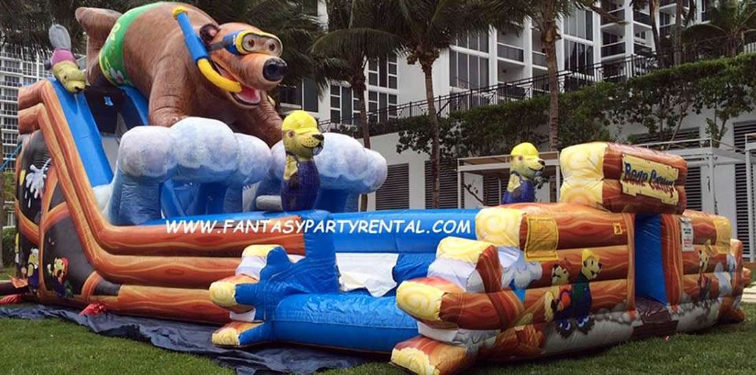 Bear Camp Double Lane Slide 24ft high features a big pool at the end of each slide. This great waterslide is designed with beautiful artwork displayed throughout the front and sides of it.