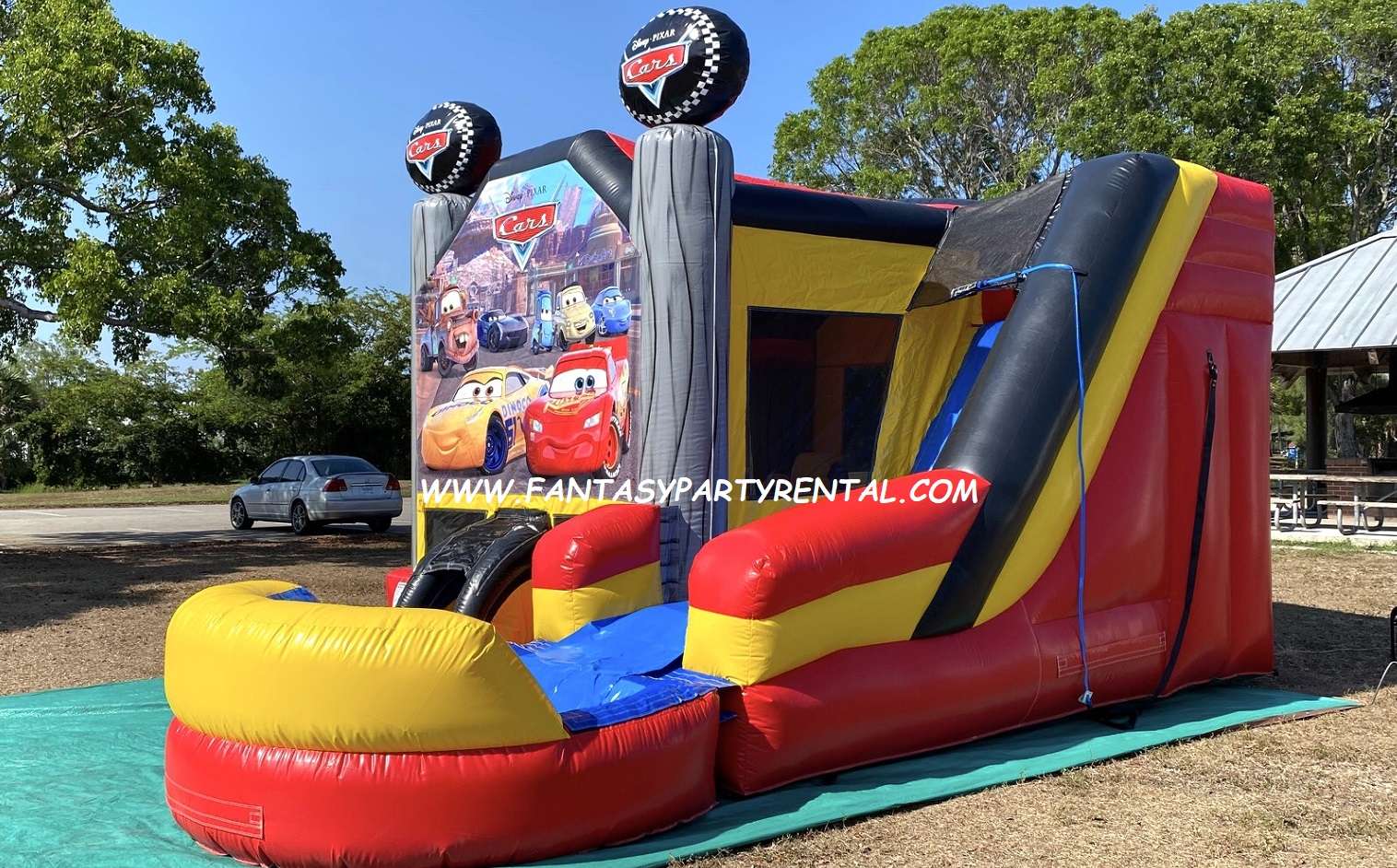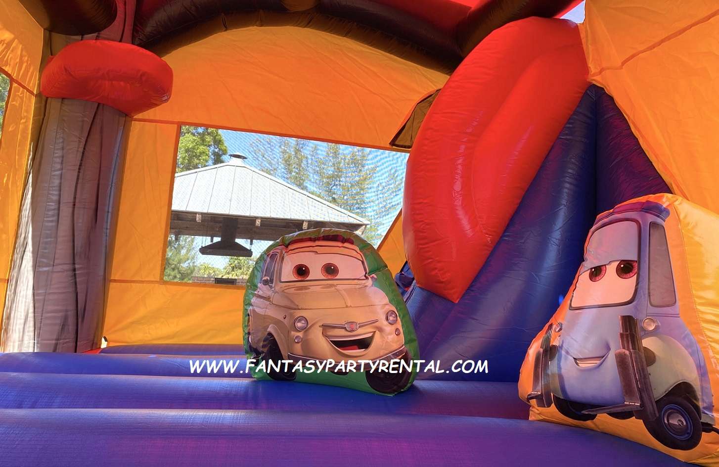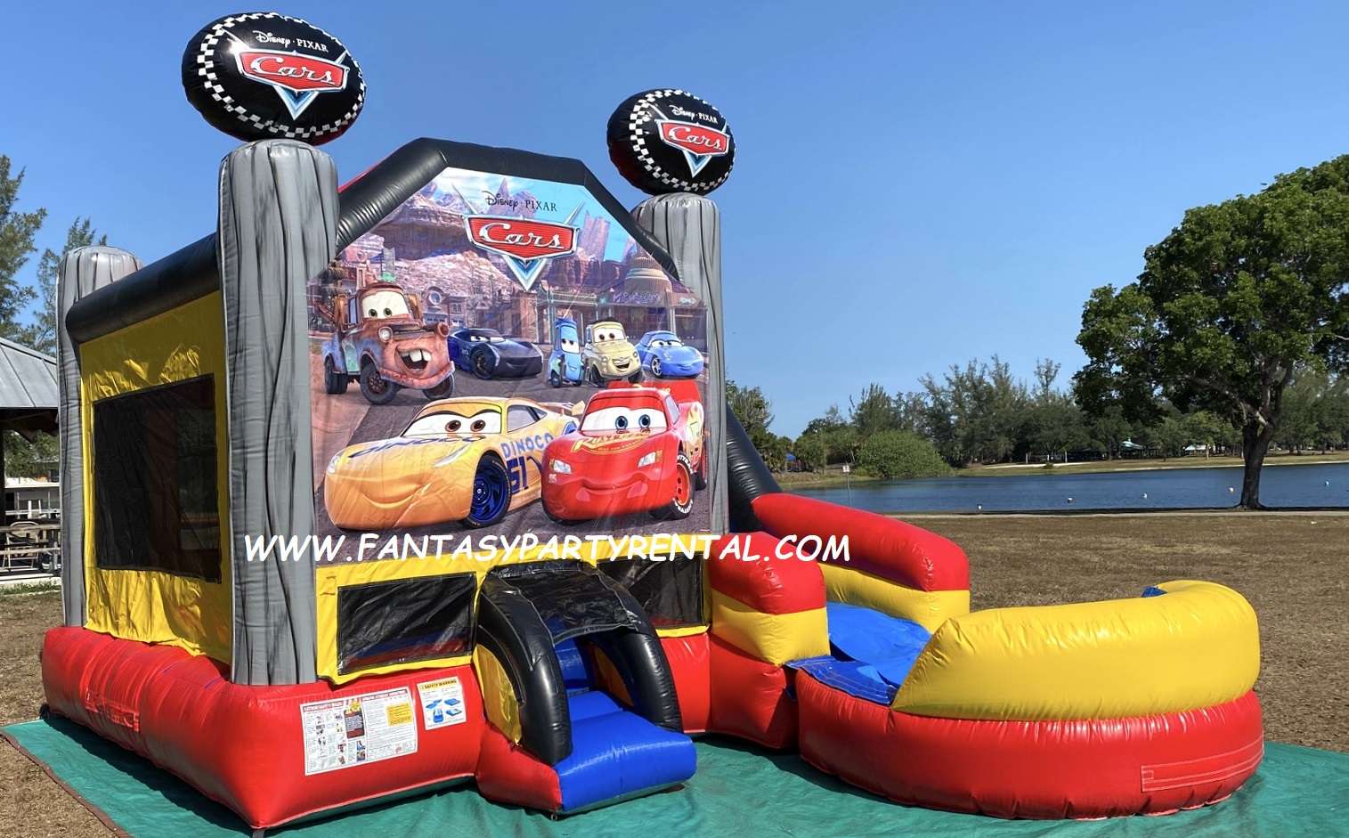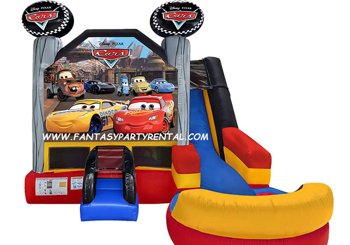 Disney Pixar Cars Combo 6 in 1 Bounce House. This Wet combo ride features six different inflatable activities. With a big bouncing area, a basketball hoop, inflated obstacle pop-ups, a wall climber, and a wet slide and pool. Kids with surely have so much fun!.