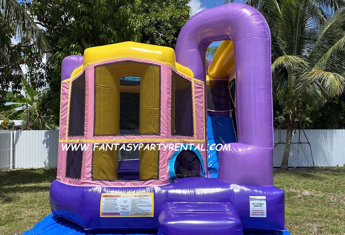 The Dazzling Backyard Combo 4 in 1 features a big bouncing area, basketball hoop, climbing area and dry slide.