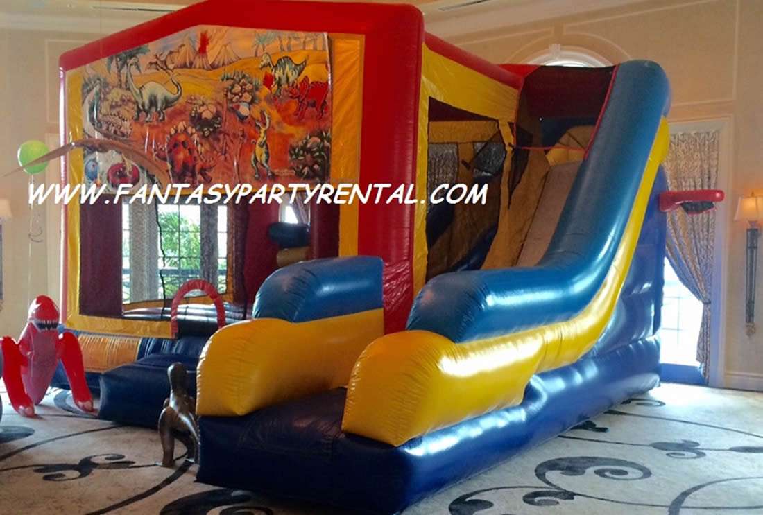 Dinosaur Planet Combo 7 in 1. Jumping area, 2 basketball hoops, Pop up obstacles, side obstacles, Climbing area, dry slide.