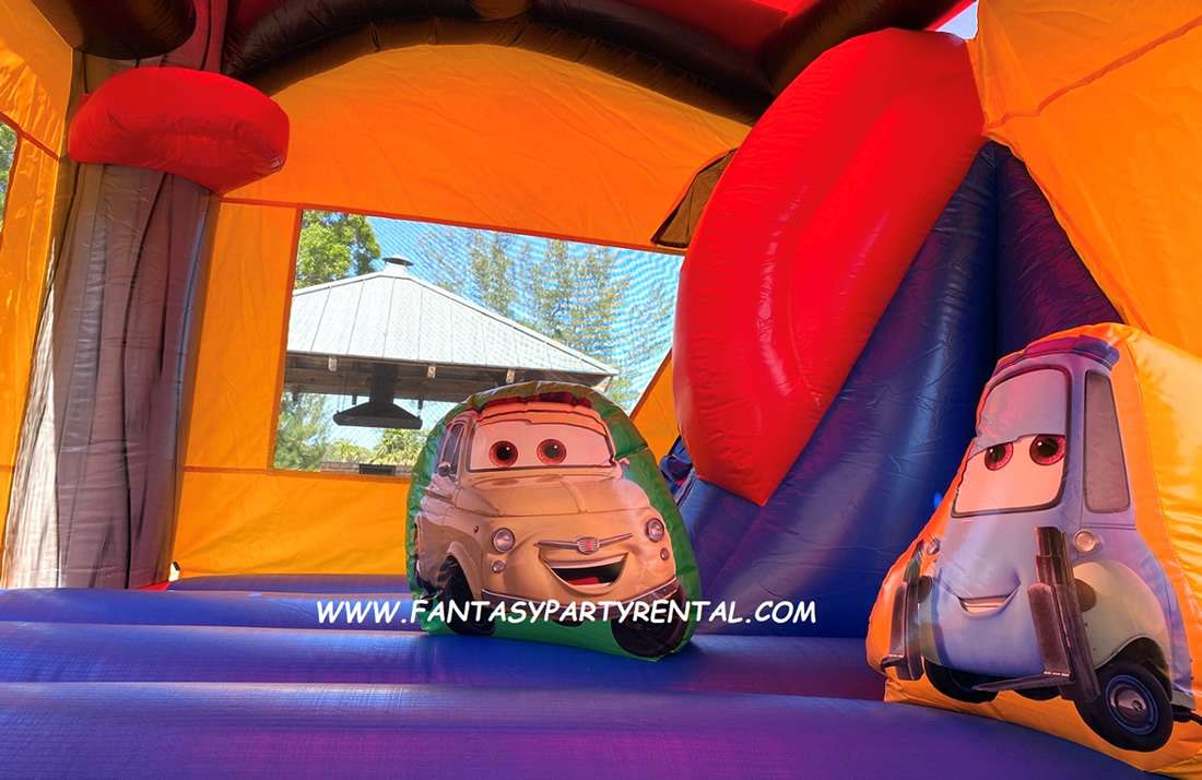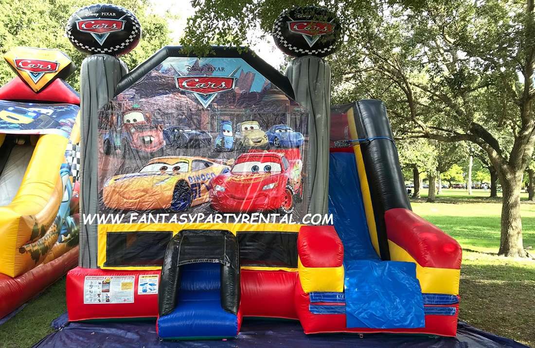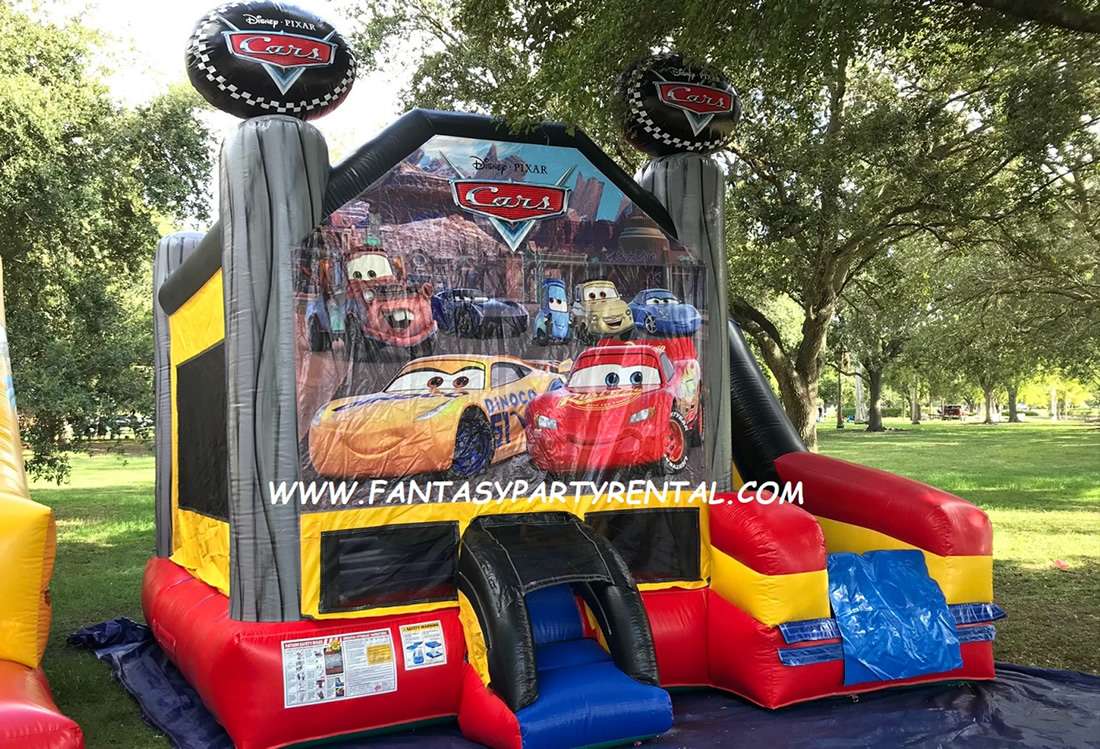 Disney Pixar Cars Combo 5 in 1 Bounce House. This Dry combo ride features five different inflatable activities. With a big bouncing area, a basketball hoop, inflated obstacle pop-ups, a wall climber, and a dry slide. Kids with surely have so much fun!.