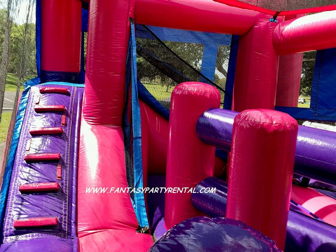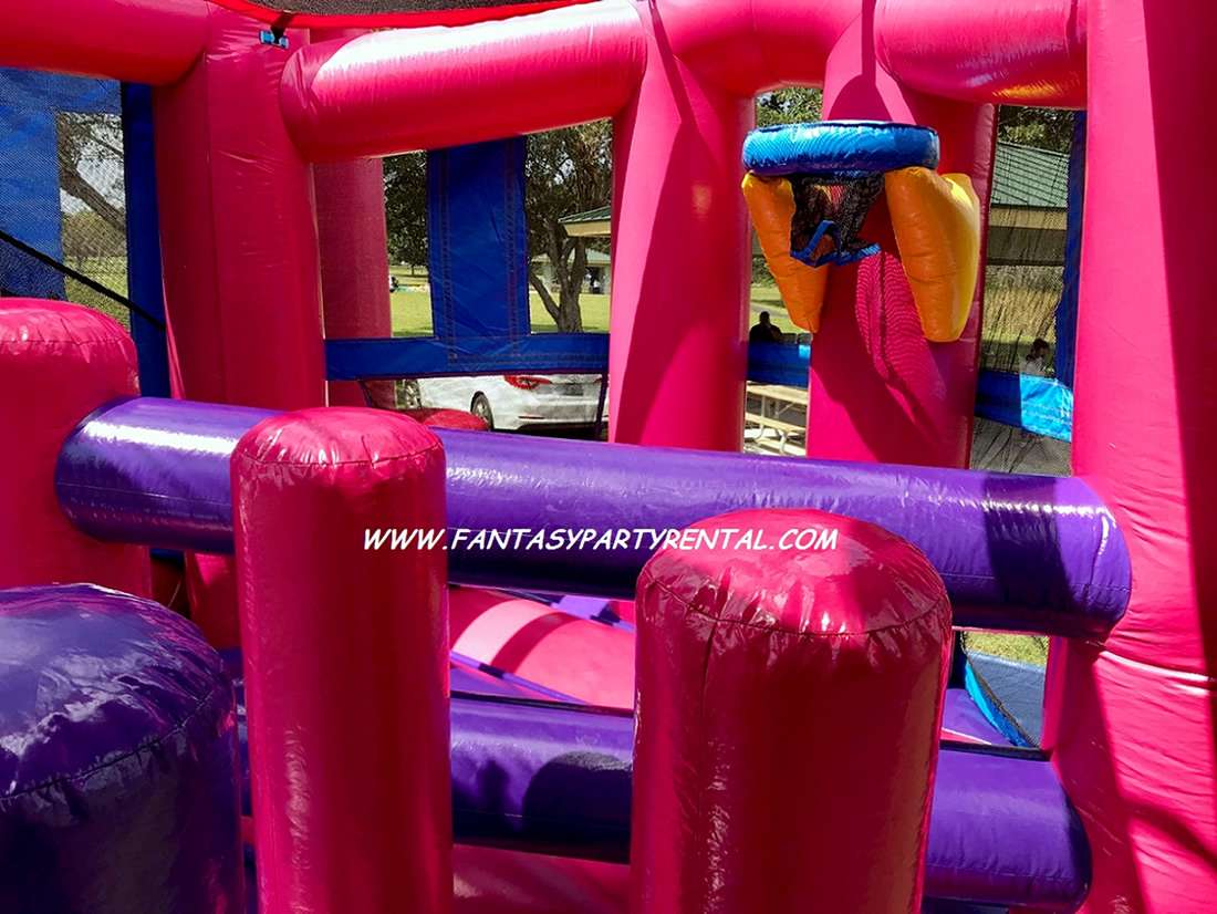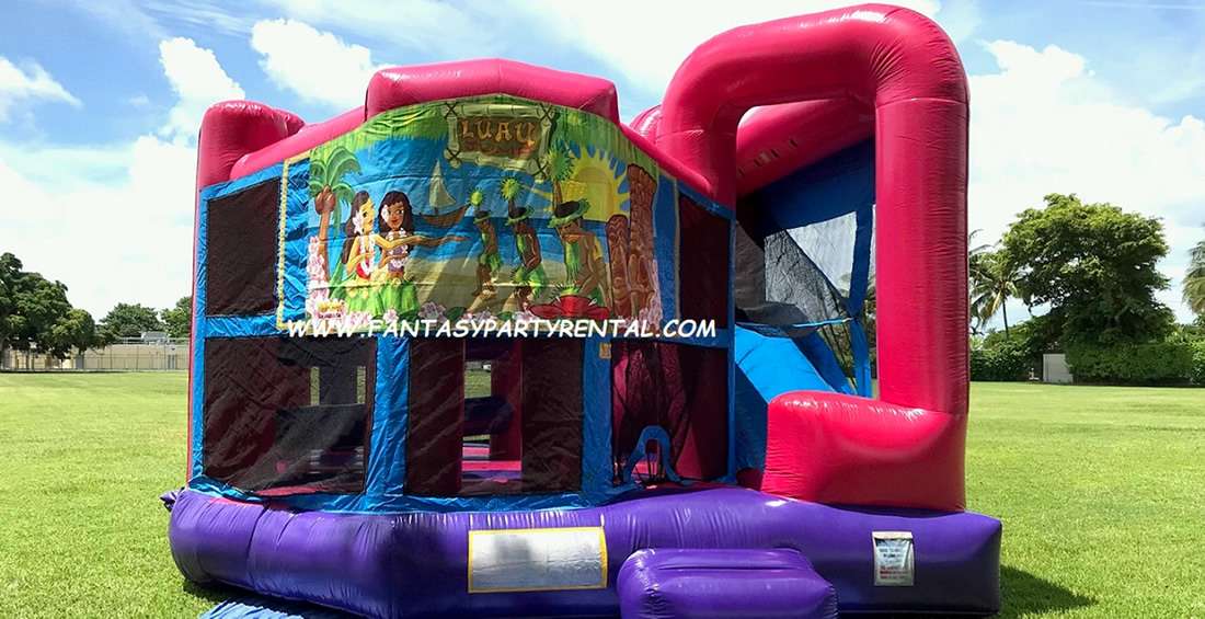 The Dream Collection Combo 5 in 1 Luau theme is a great addition to any kid’s event. It has bright Hot pink, purple and blue colors, This combo bounce house offers a jumping area, pop up obstacles, basketball hoop, climbing area and a dry slide.