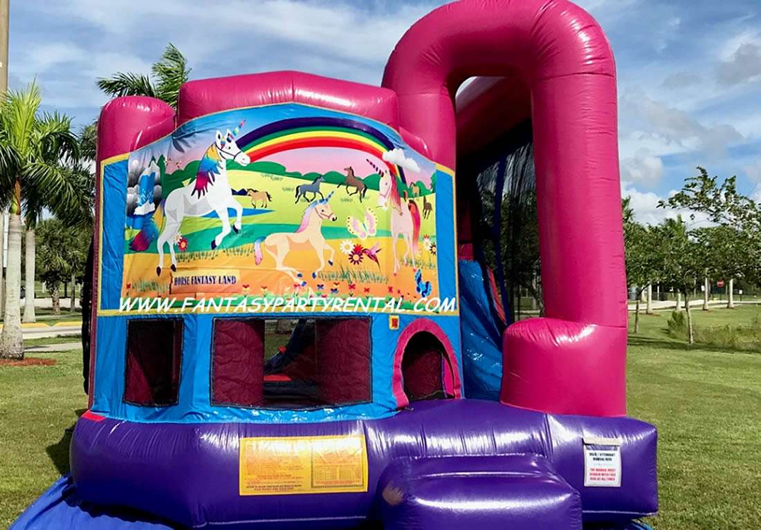 The Dream Horse Fantasy Land Backyard Combo 4 in 1 is So Much Fun. It features a jumping area, basketball hoop, climbing area, dry slide.