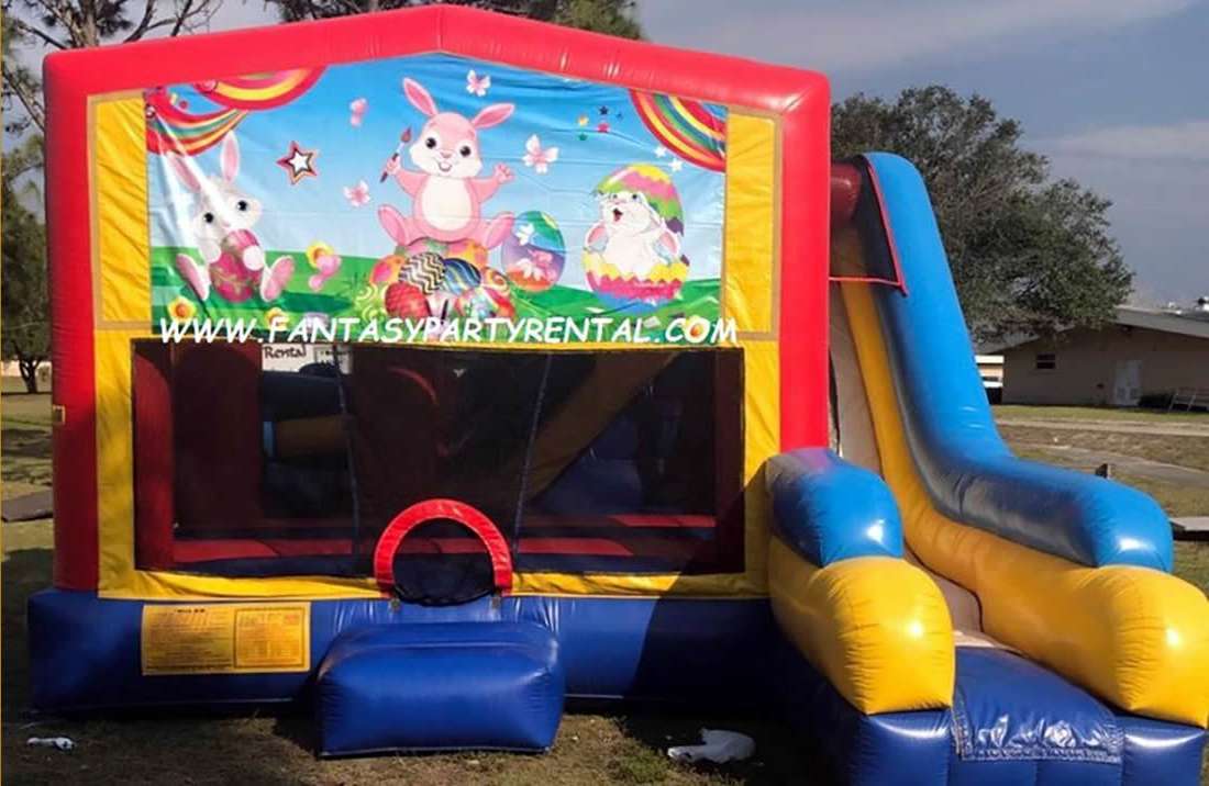 Easter Combo 7 in 1. Jumping area, 2 basketball hoops, Pop up obstacles, side obstacles, Climbing area, dry slide.