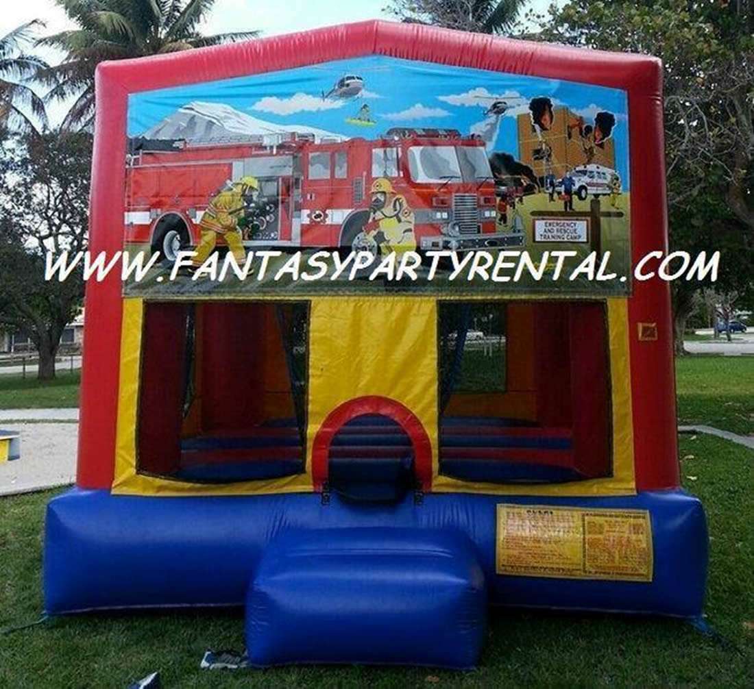 Fireman Bounce House 13×13 with basketball hoop. Yellow, red and blue color combination with mesh all around for easy view.