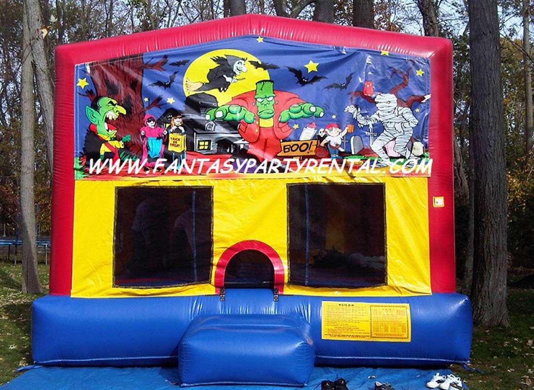 Halloween #1 Bounce House 13×13 with basketball hoop. Yellow, red and blue color combination with mesh all around for easy view.