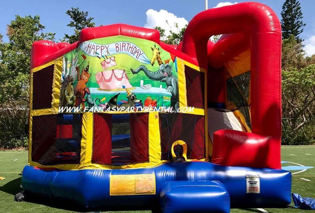 Happy Birthday Combo 5 in 1. Featuring a big bouncing area, climb, dry slide, pop up obstacles and a basketball hoop.