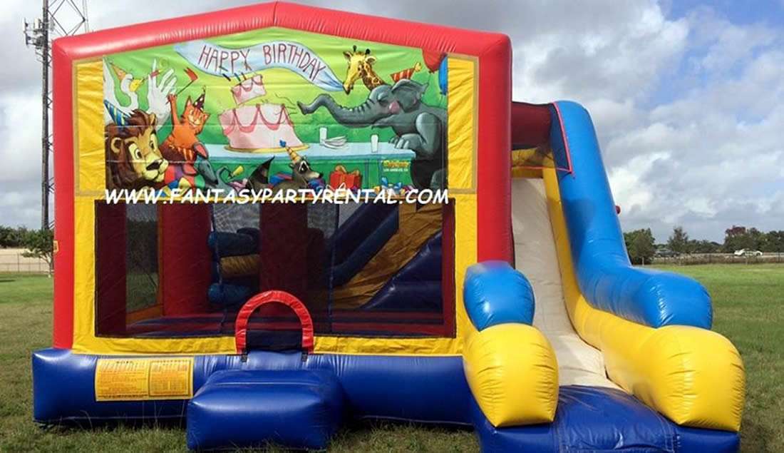 Happy Birthday Combo 7 in 1. Jumping area, 2 basketball hoops, Pop up obstacles, side obstacles, Climbing area, dry slide.