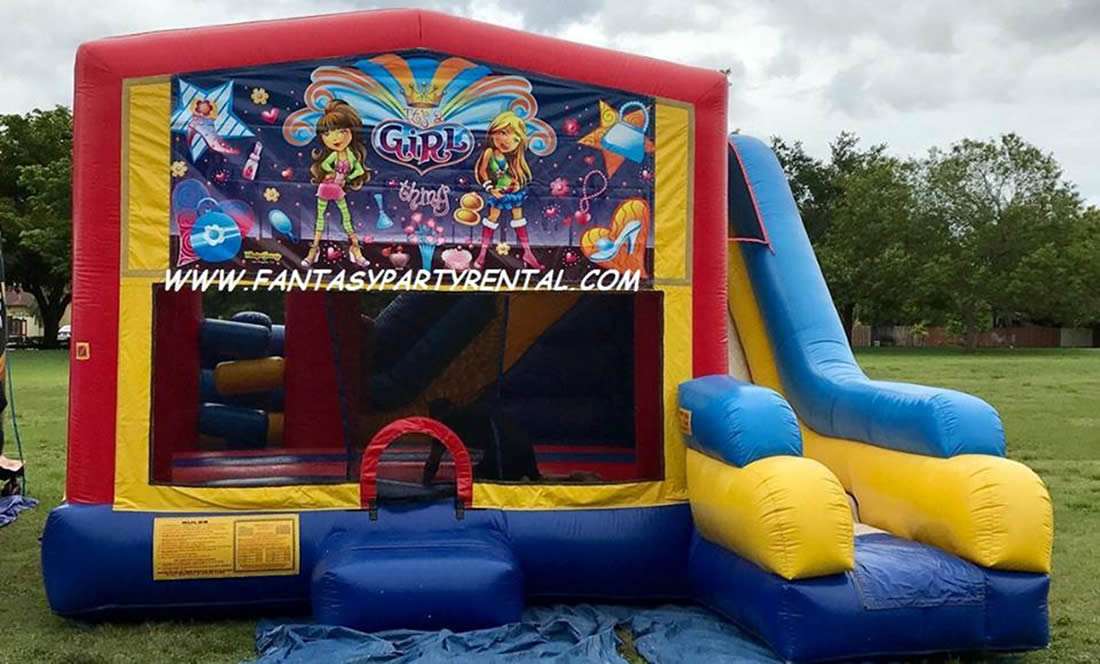 It’s a Girl Thing Combo 7 in 1. Jumping area, 2 basketball hoops, Pop up obstacles, side obstacles, Climbing area, dry slide.