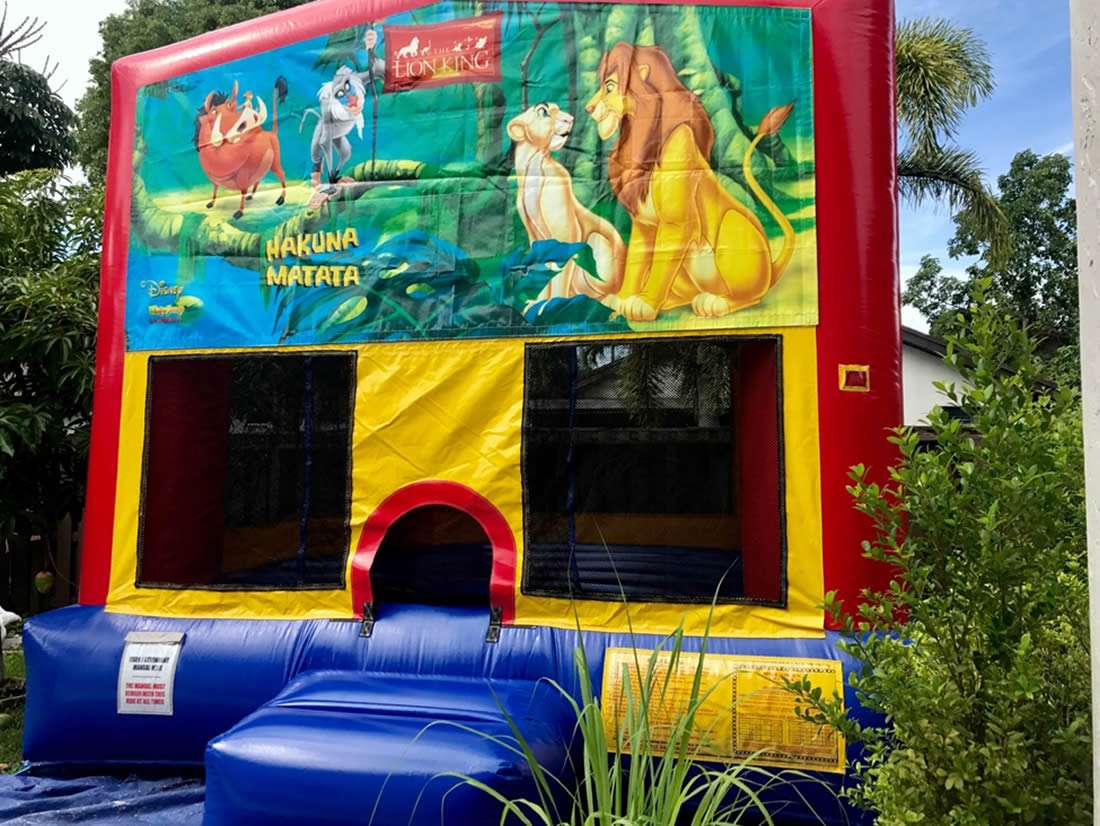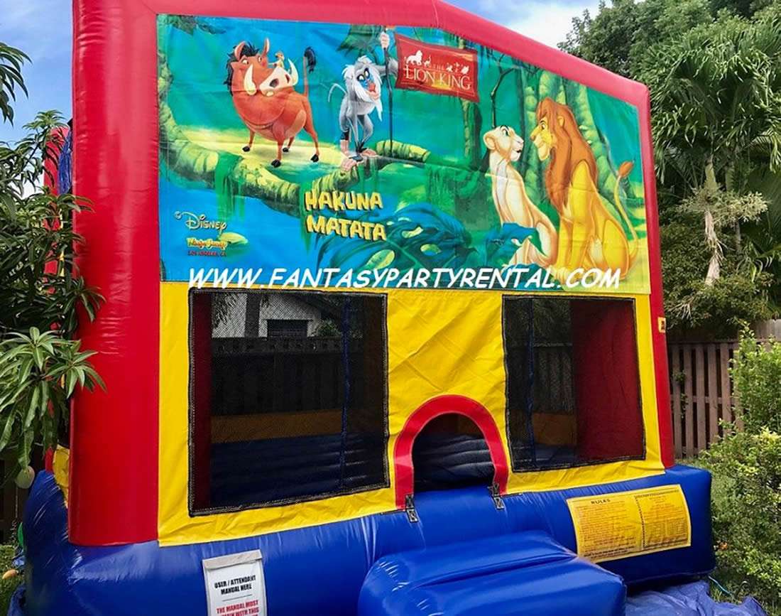 Lion King Bounce House 13×13 with basketball hoop. Yellow, red and blue color combination with mesh all around for easy view.