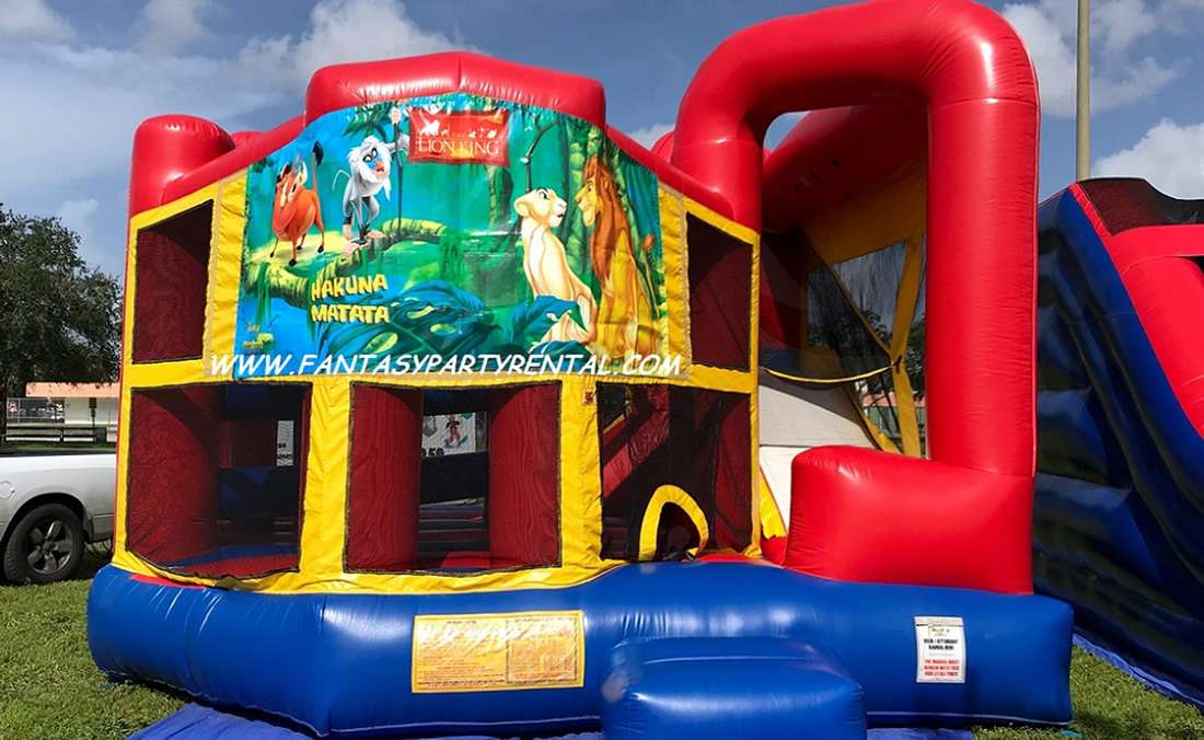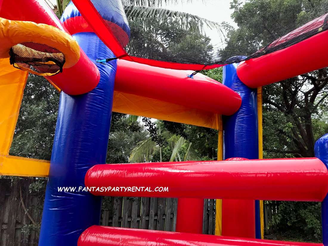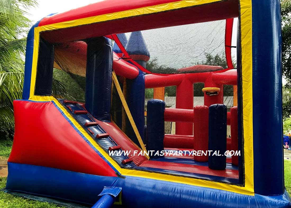 The Combo features a big jumping area, pop up obstacles, basketball hoop, climbing area and dry slide. The 360-degree mesh sides of this moonwalk offer parents and spectators a clear view.