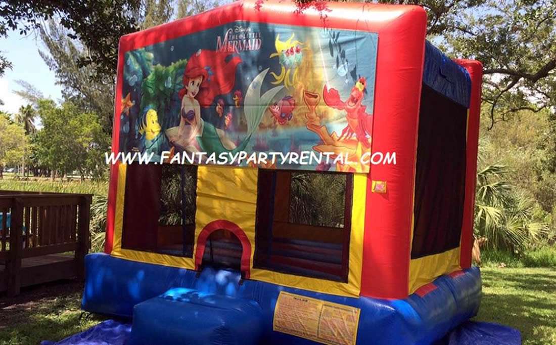 Little Mermaid Bounce House 13×13 with basketball hoop. Yellow, red and blue color combination with mesh all around for easy view.