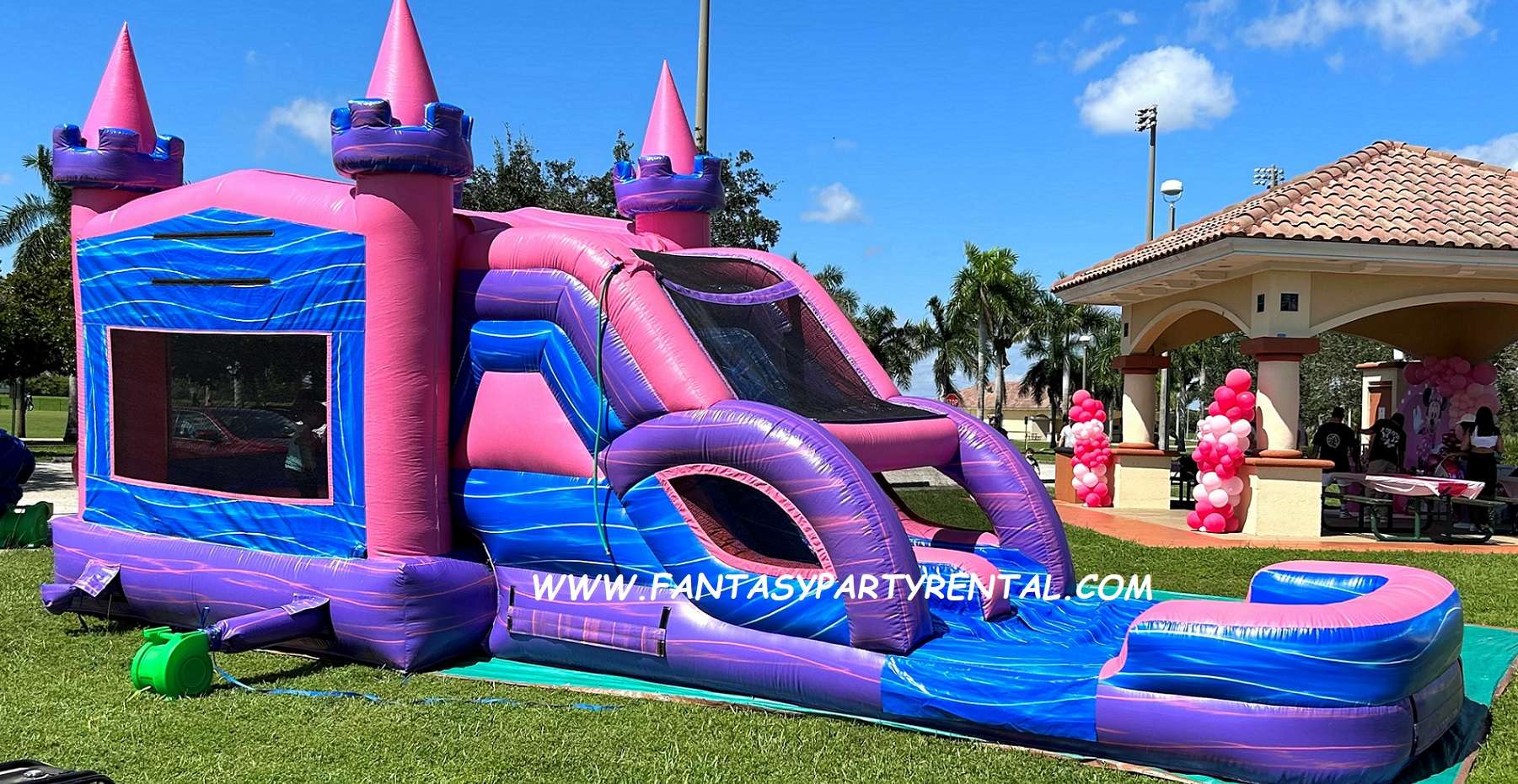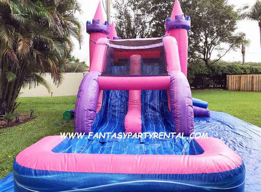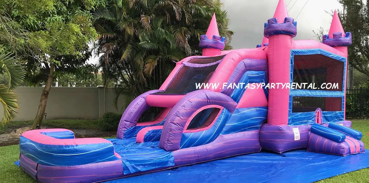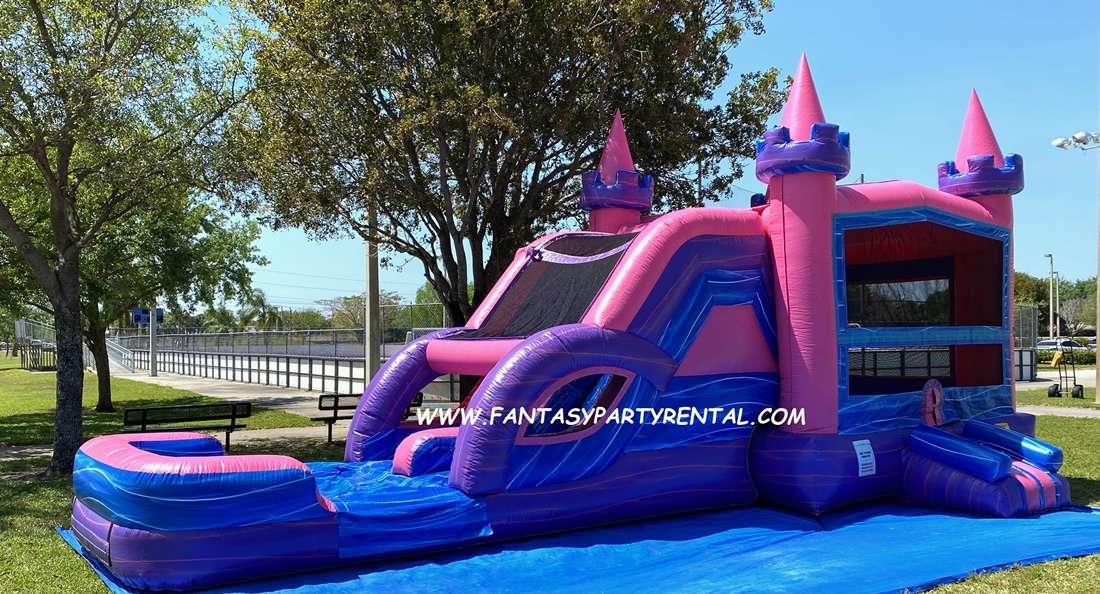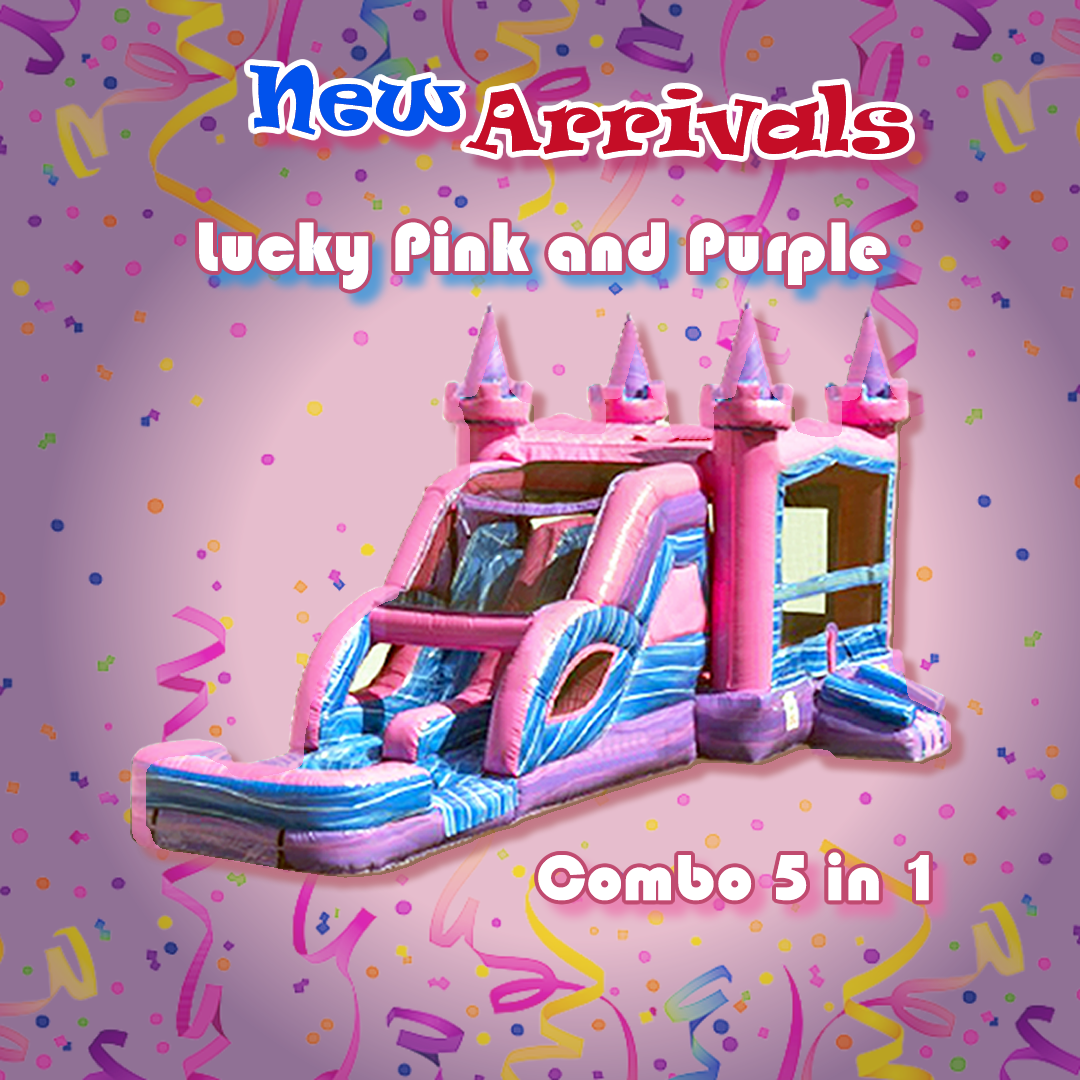 The Lucky Pink and Purple Combo 5 in 1 wet/dry slide features fun activities. A large bouncer area, basketball hoop, climbing area, and a double lane slide. It offers the option to use the slide wet with a splash pool or dry. This versatile inflatable provides hours of fun for children.
