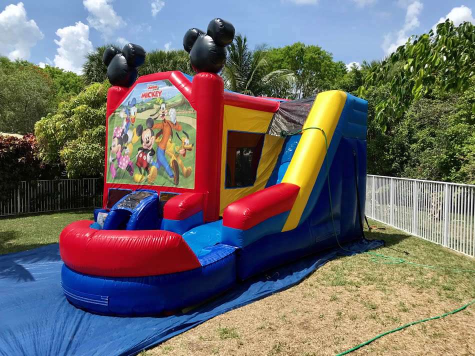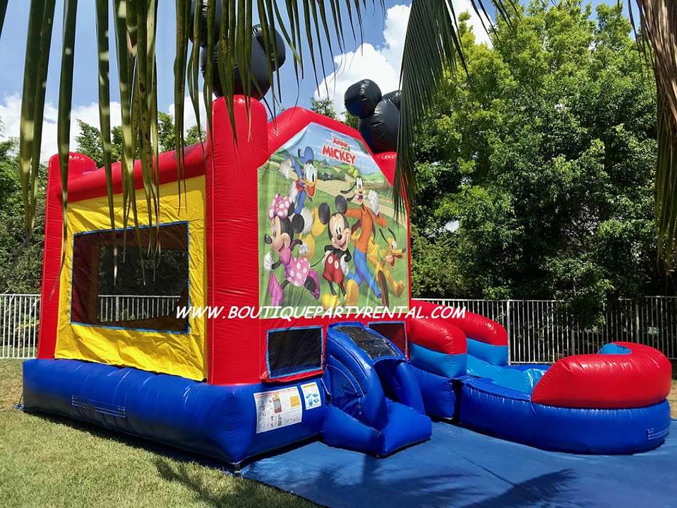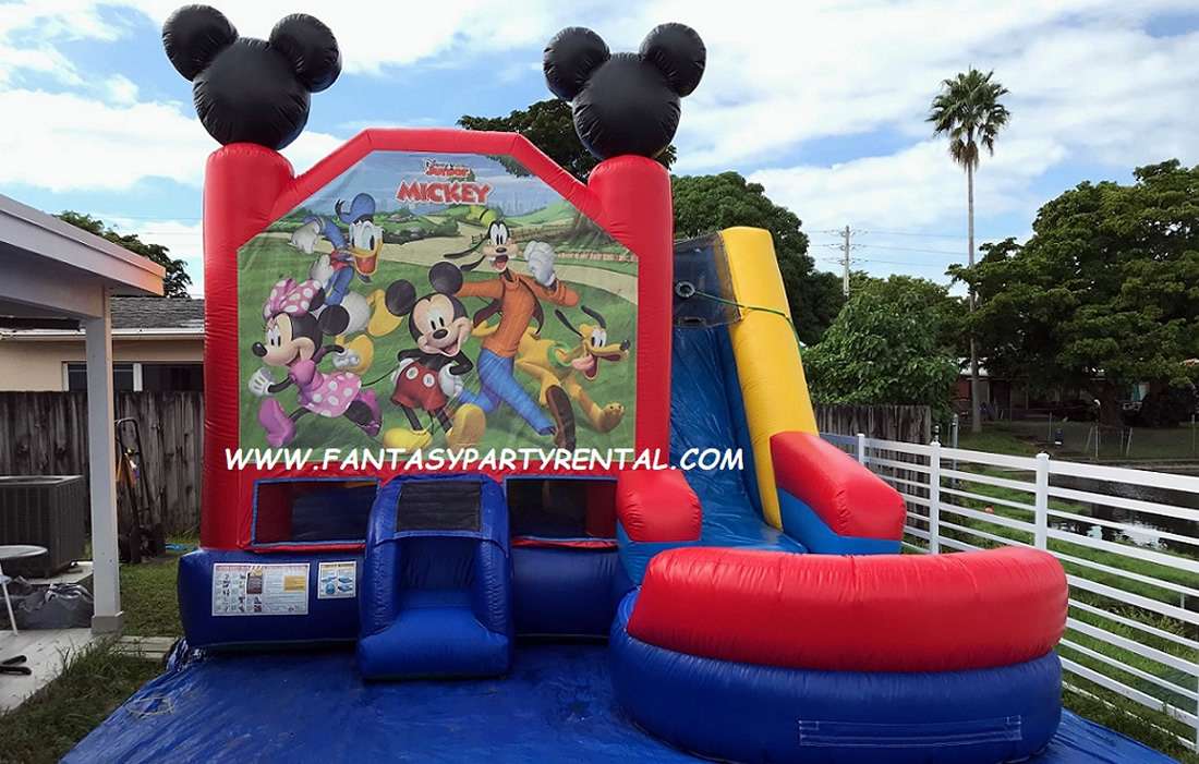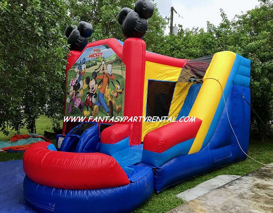 Mickey And Friends Combo 6 in 1 offers a big bouncing area, basketball hoop, themed pop up obstacles, climb, slide and pool.