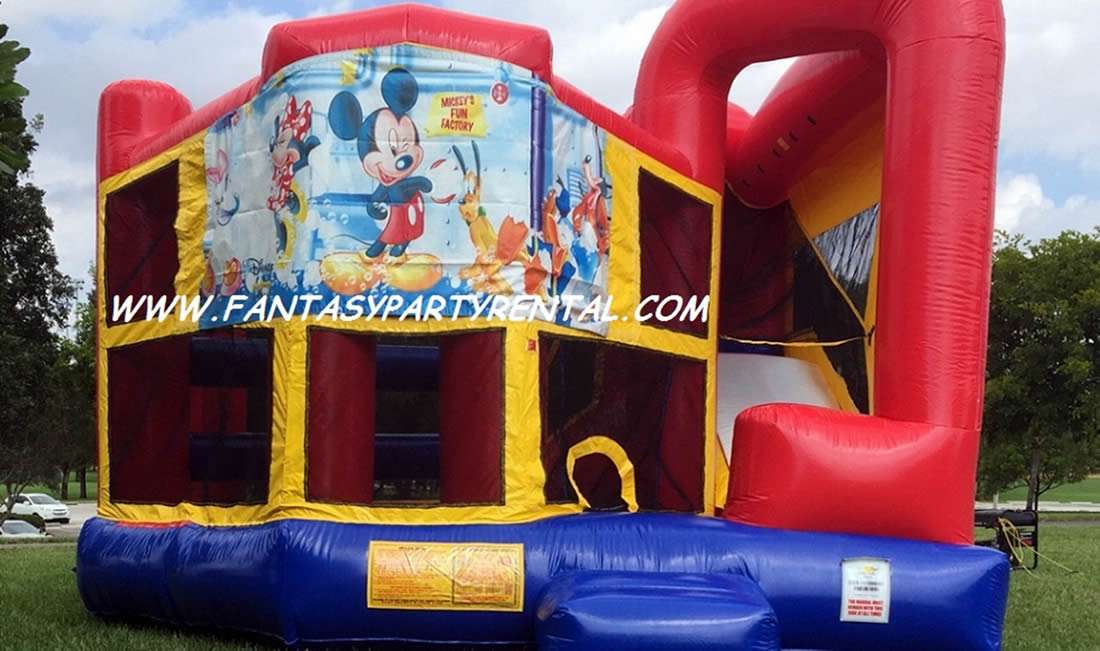 Mickey Mouse Combo 5 in 1 #2. Featuring a big bouncing area, climb, dry slide, pop up obstacles and a basketball hoop.