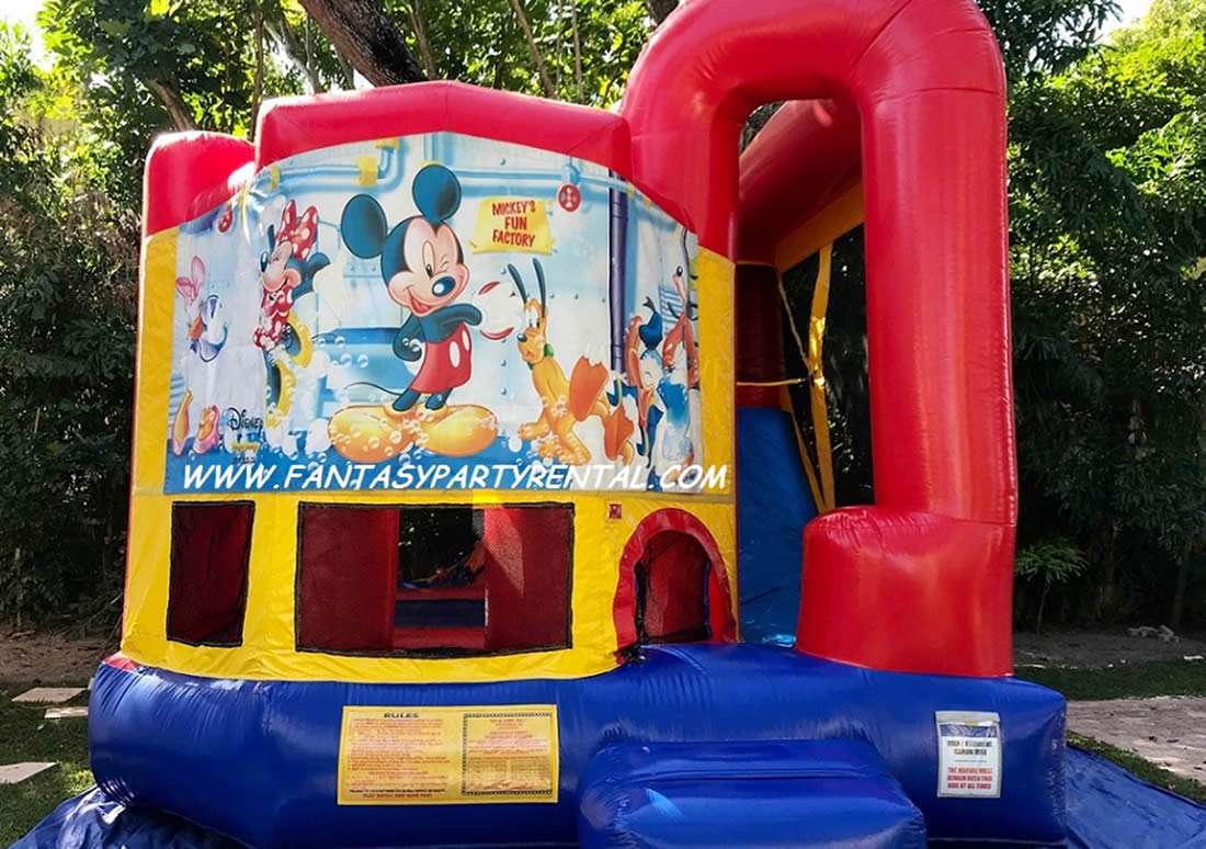 The Mickey Mouse Backyard Combo 4 in 1 is So Much Fun. It features a jumping area, basketball hoop, climbing area, dry slide.