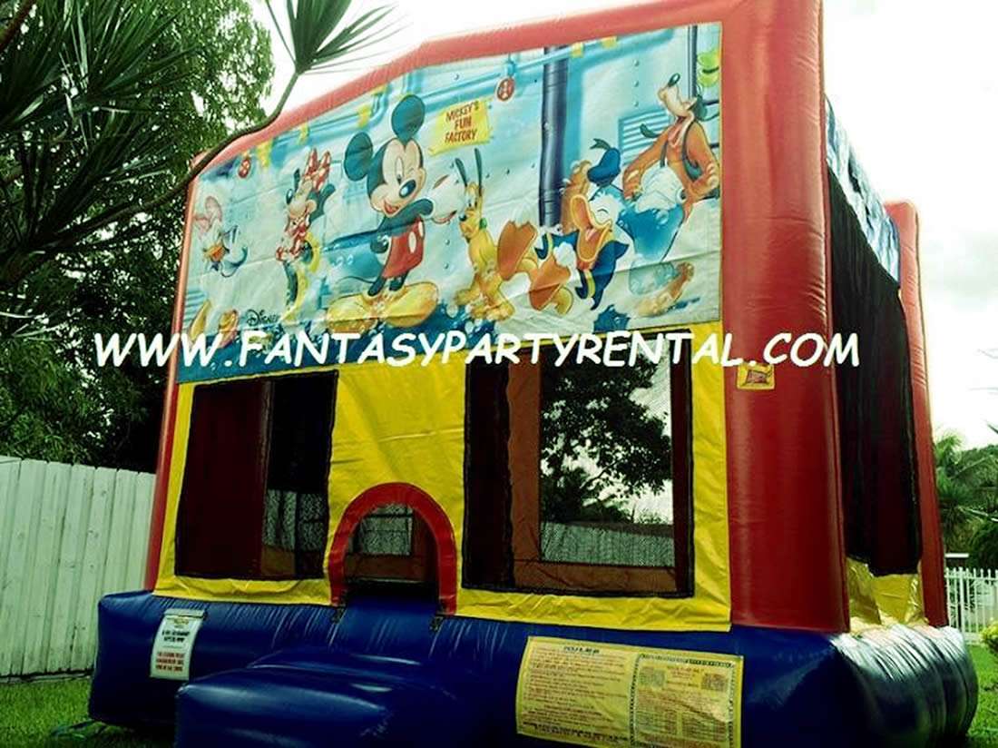 Mickey Mouse Bounce House 13×13 with basketball hoop. Yellow, red and blue color combination with mesh all around for easy view.