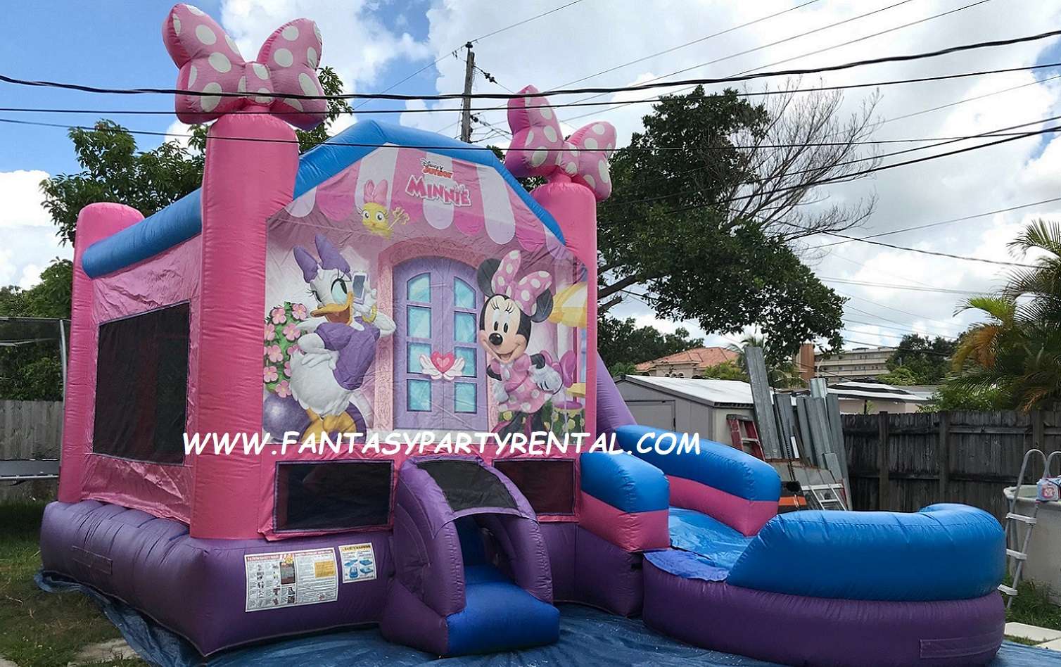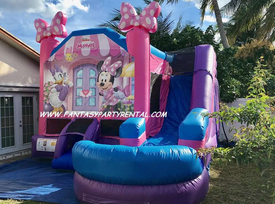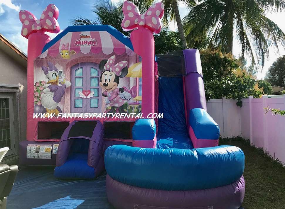 Minnie Mouse Combo 6 in 1 offers a big bouncing area, basketball hoop, themed pop up obstacles, ,climb, wet slide, pool.