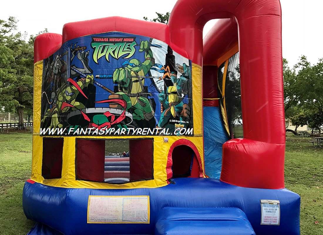 The Ninja Turtle Backyard Combo 4 in 1 is So Much Fun. It features a jumping area, basketball hoop, Climbing area, dry slide.