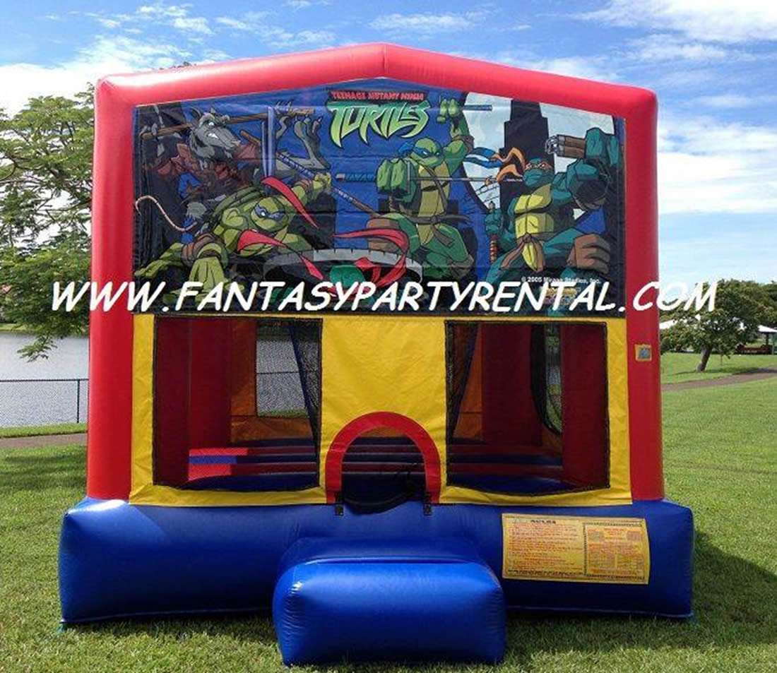 Ninja Turtle Bounce House 13×13 with basketball hoop. Yellow, red and blue color combination with mesh all around for easy view.