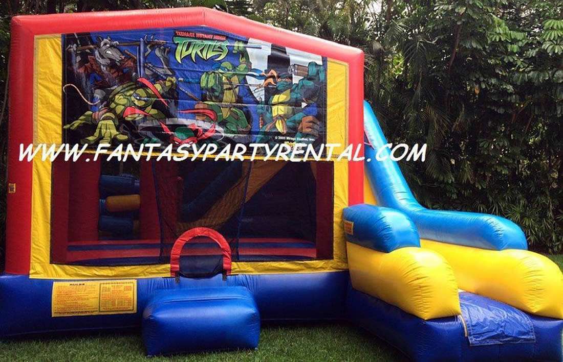 Ninja Turtle Combo 7 in 1. Jumping area, 2 basketball hoops, Pop up obstacles, side obstacles, Climbing area, dry slide.