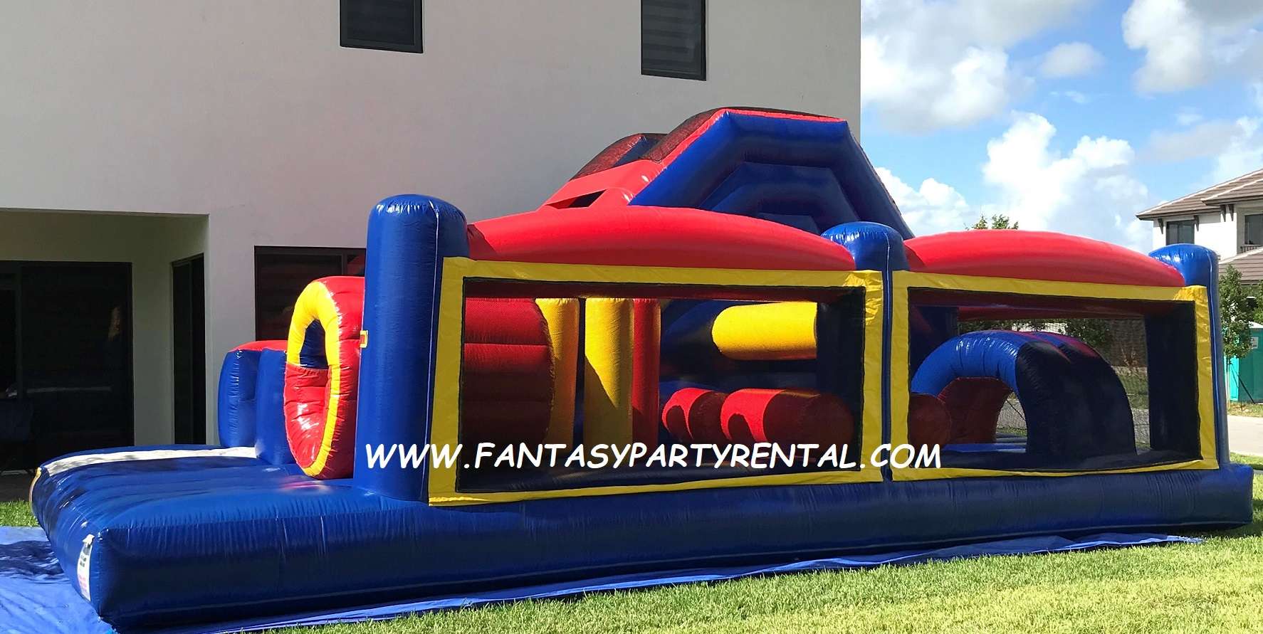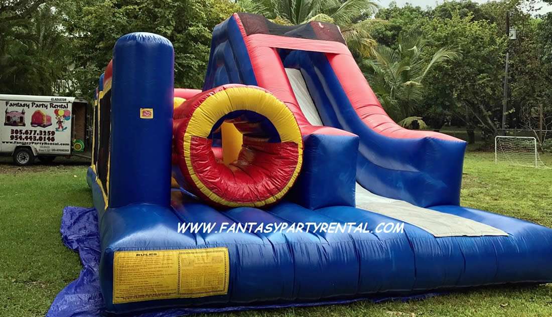 The inflatable play structure begins with a front-loading obstacle entrance, taking participants through tunnels and pop-ups. These facilitate maneuvering skills and build confidence.