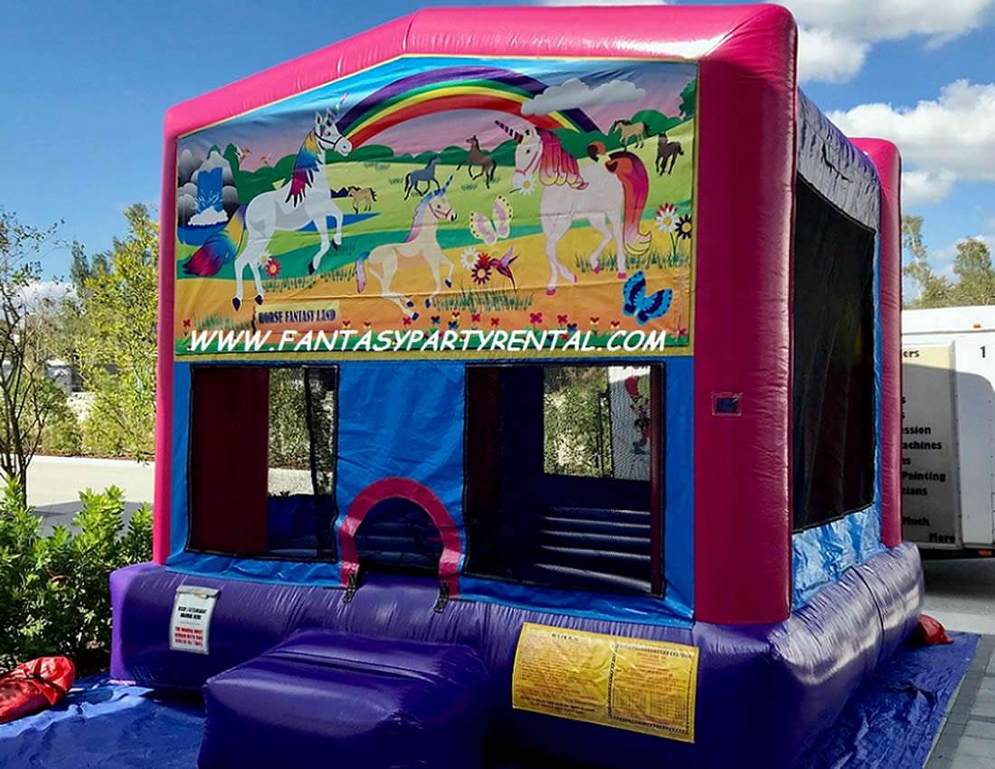 Pink Dream modular Bounce house with basketball hoop. Pink and purple color combination with mesh all around for easy view.