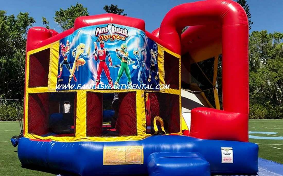 Power Rangers Combo 5 in 1 #2. Featuring a big bouncing area, climb, dry slide, pop up obstacles and a basketball hoop.
