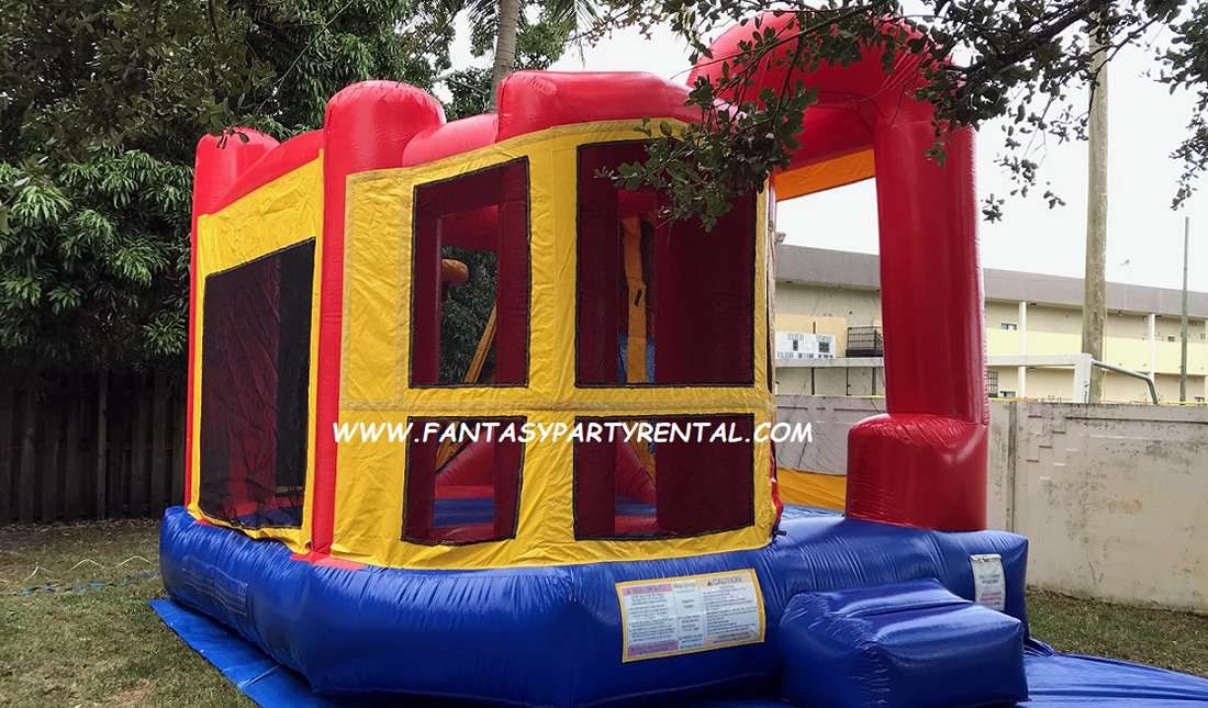 The Primary Colors Backyard Combo 4 in 1 is So Much Fun. It features a jumping area, basketball hoop, climbing area, dry slide.