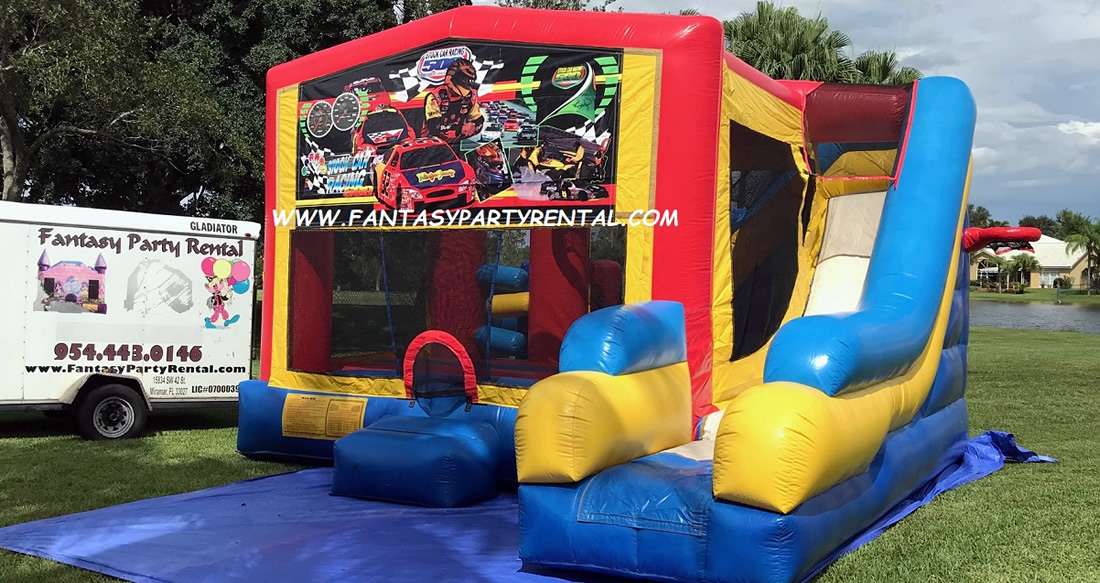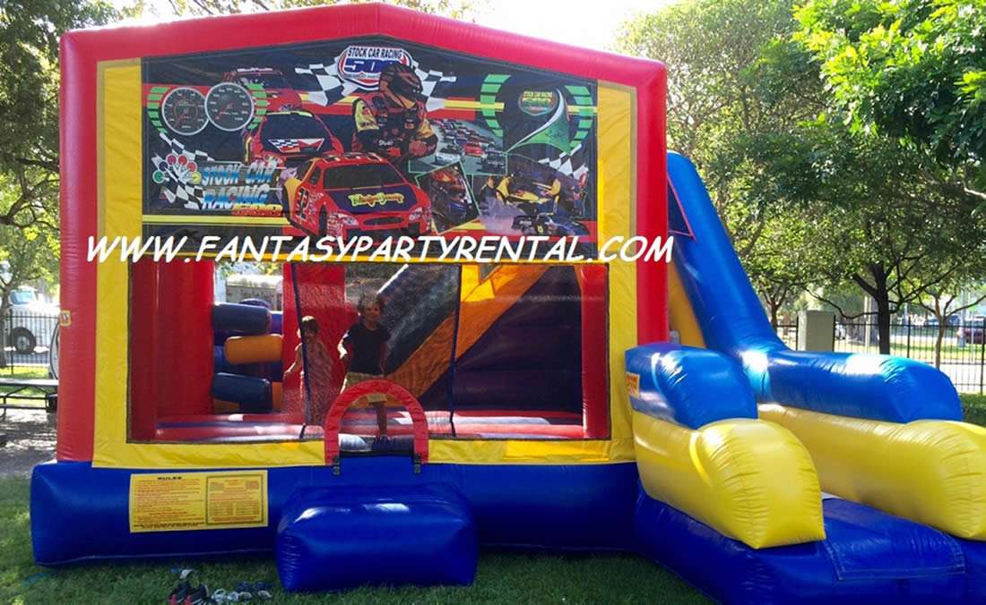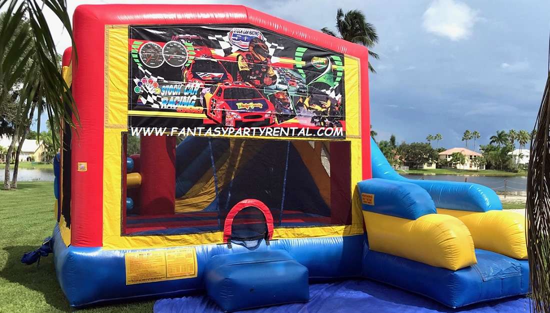 Racing Cars Combo 7 in 1. Jumping area, 2 basketball hoops, Pop up obstacles, side obstacles, Climbing area, dry slide.