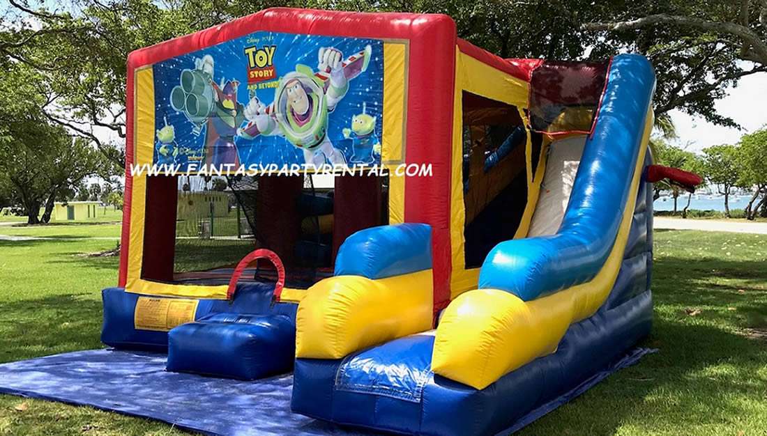 Combo 7 in 1 (bounce, pop up and side obstacles, 2 basketball hoops, climbing area and dry slide). Many themes to choose from.