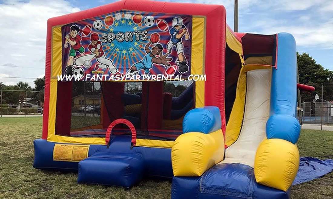 Sports Combo 7 in 1. Jumping area, 2 basketball hoops, Pop up obstacles, side obstacles, Climbing area, dry slide.