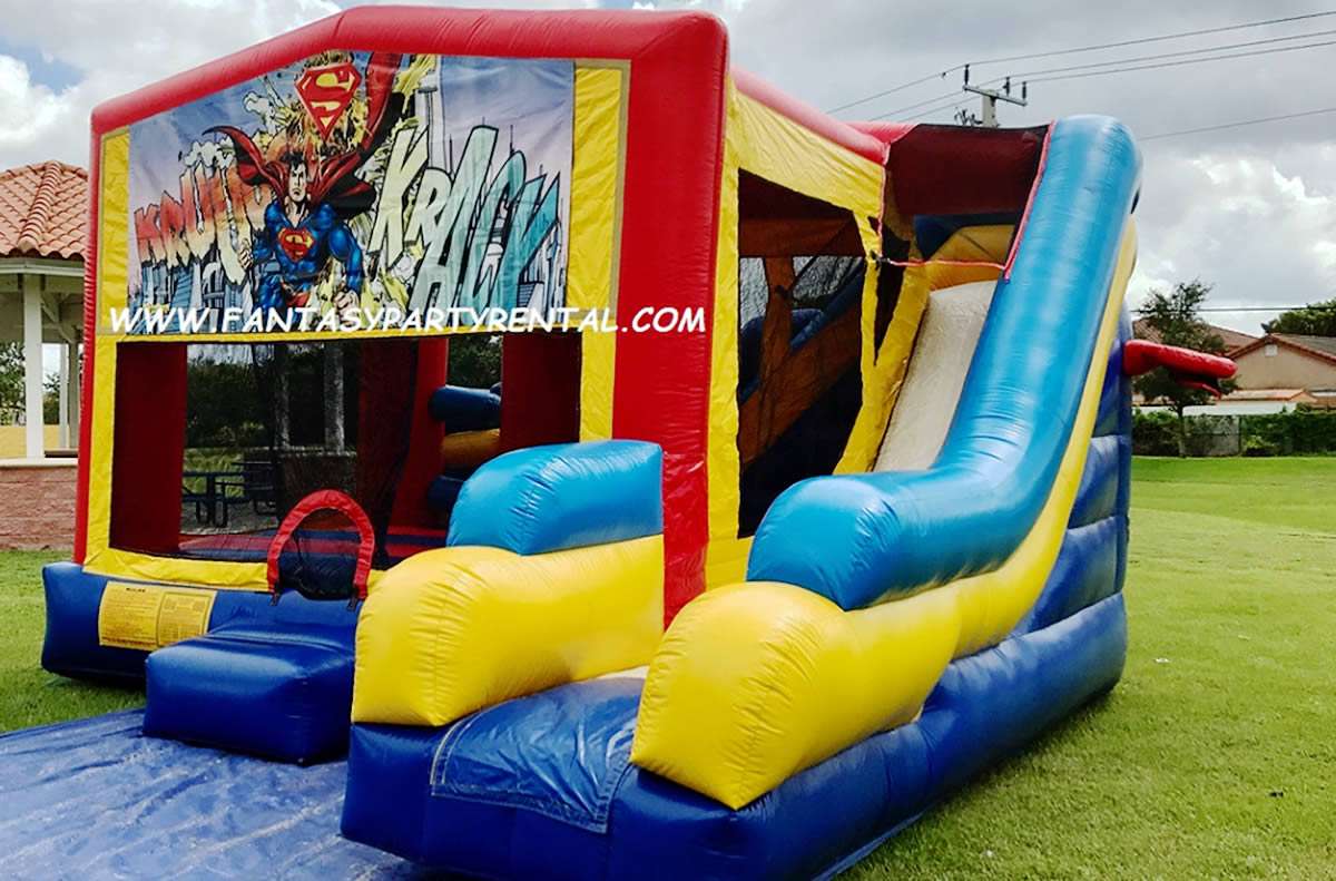 Superman Combo 7 in 1. Jumping area, 2 basketball hoops, Pop up obstacles, side obstacles, Climbing area, dry slide.
