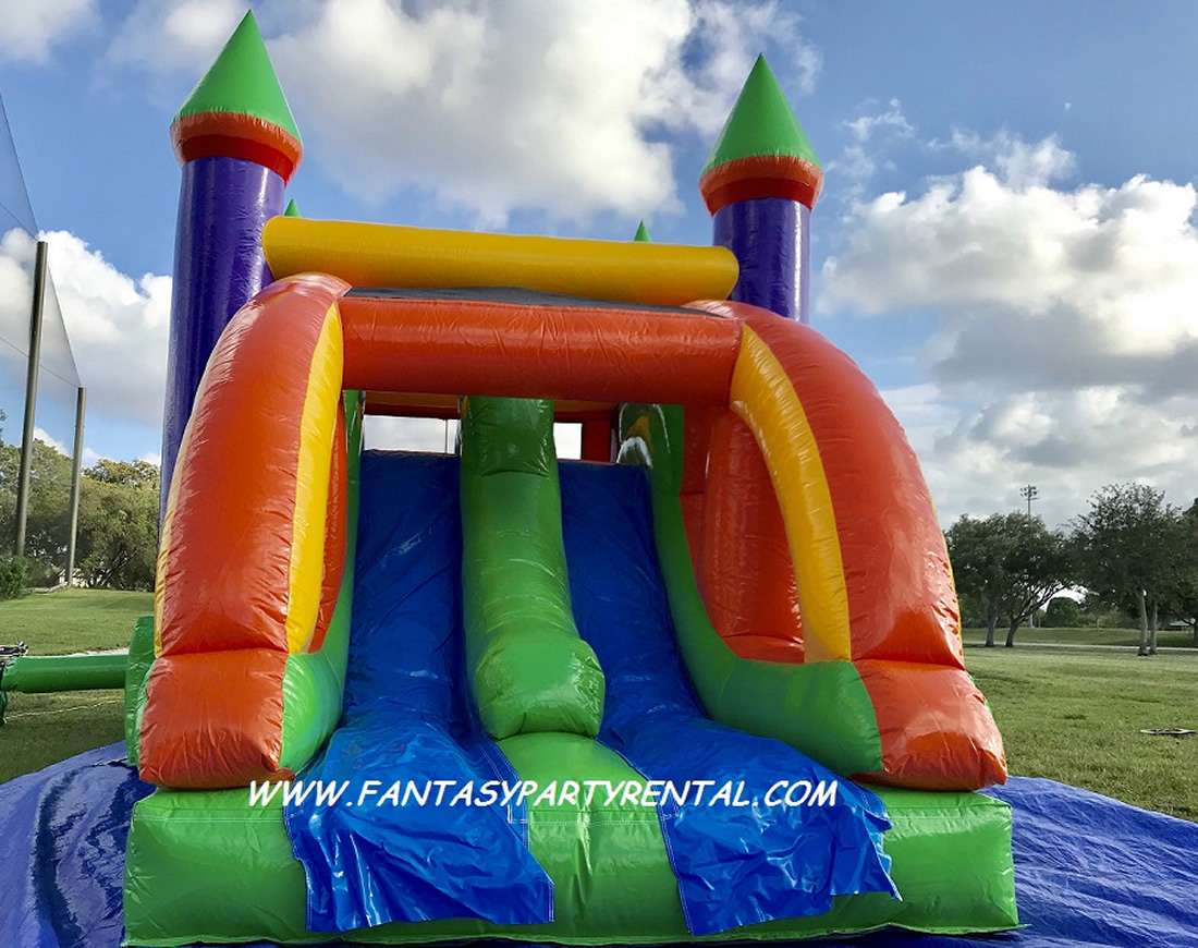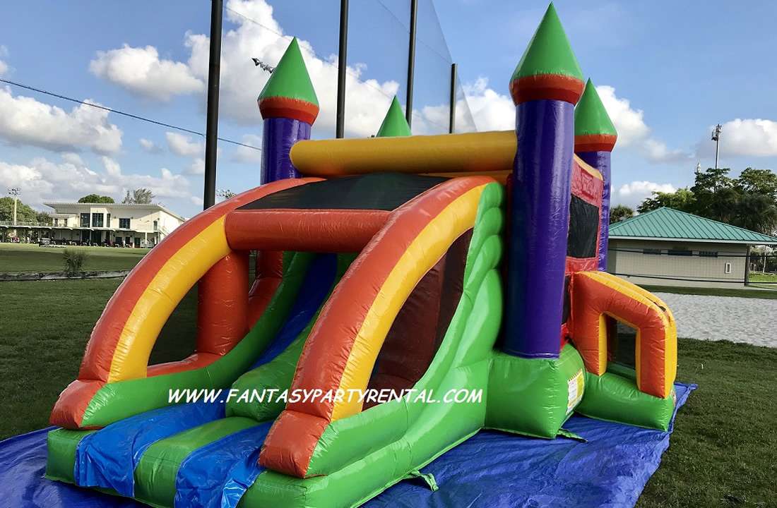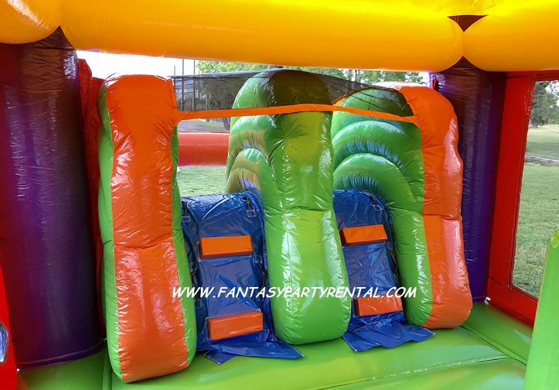 Toddler Combo 5 in 1 Dual Lane dry slide offers a bouncing area, pop up obstacles, basketball hoop, climb, dry slides.