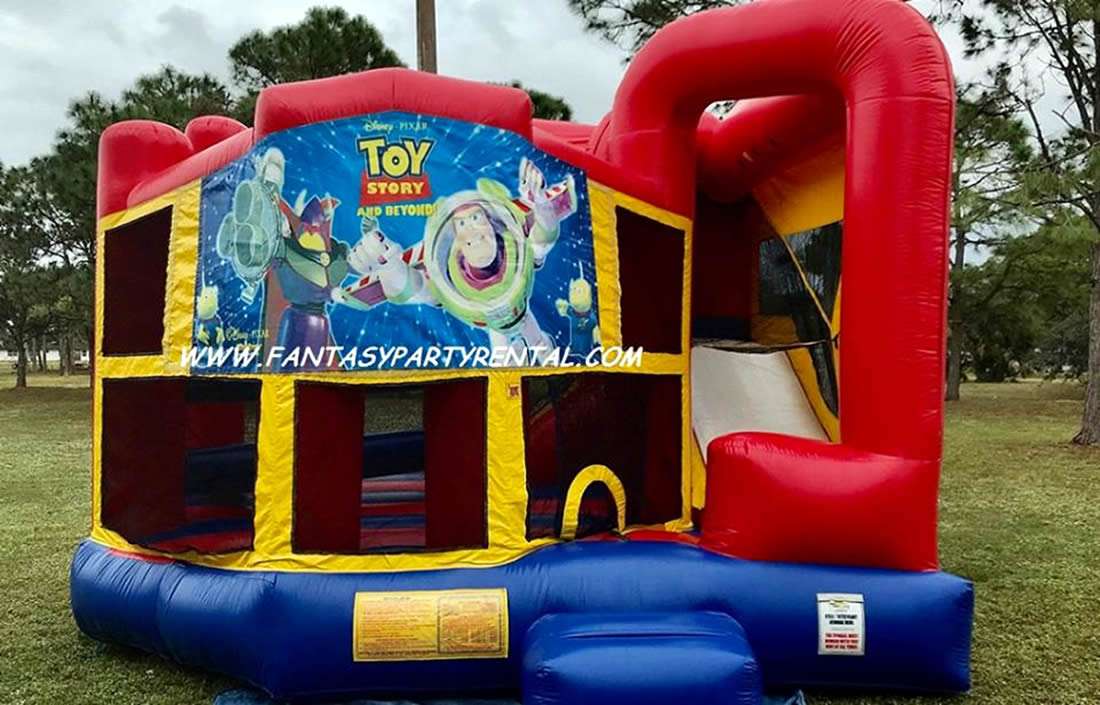 Toy Story Combo 5 in 1. Featuring a big bouncing area, climb, dry slide, pop up obstacles and a basketball hoop.