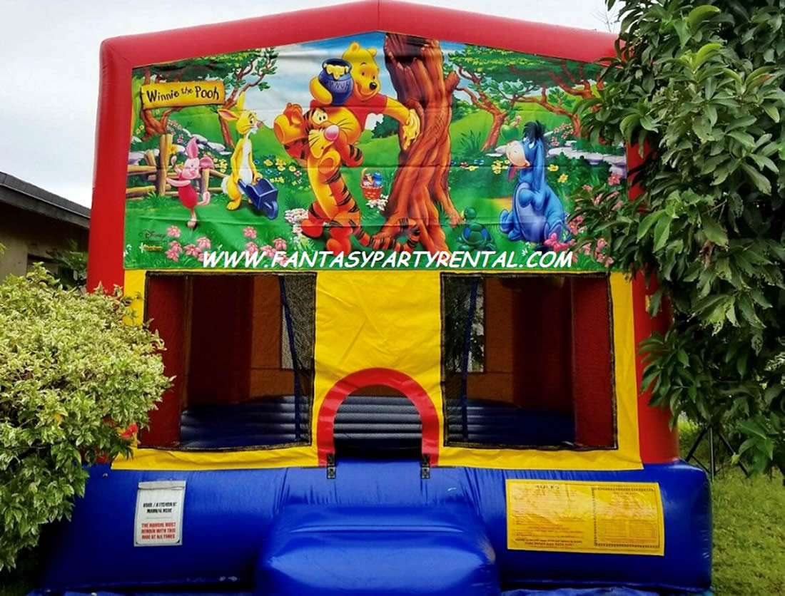 Winnie The Pooh Bounce House 13×13 with basketball hoop. Yellow, red and blue color combination with mesh all around for easy view.